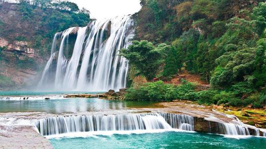 黄果树大瀑布位于贵州安顺镇宁布依族苗族自治县境内白水河上,连环密布的瀑布群而闻名于海内外,享有“中华第一瀑”之盛誉,也是世界上最阔大壮观的瀑布之一。奔腾的白水河在这里从悬崖绝壁上直泻而下,形成九级瀑布,落差共为105.4米,漩涡无数,声如雷鸣,响达千米。水雾经阳光折射,五彩缤纷,变幻无穷,气象万千,风景极为壮观。为便于观赏瀑布奇景,附近建有观瀑亭、望水亭,并筑有直通犀牛潭的台阶和石梯。黄果树瀑布是白水河上最雄浑瑰丽的乐章,它将河水的缓游漫吟和欢跃奔腾奇妙地糅合在一起。从68米高的悬崖之巅跌落的是整整一条河的热忱,它既有水量丰沛、气韵万千的恢宏,又有柔细飘逸、楚楚依人的漫柔,81米宽的瀑面上水汽飘然,若逢适当的阳光照射还可形成迷人的彩虹。从岩壁小径走去,水帘洞便赫然出现在眼前,它使横穿瀑布的探险成为可能。虽然没有花果山水帘洞的空阔奇妙,但在岩缝的空隙中穿行,让鲜丽的水珠溅一身清爽,让崎岖曲折的登临育一腔豪迈,足以令人心花怒放了。瀑底是深不可测的犀牛潭,从瀑底往下游走去,水流清澈得呈现出不可抗拒的吸引。倘若此时不掬一掌……