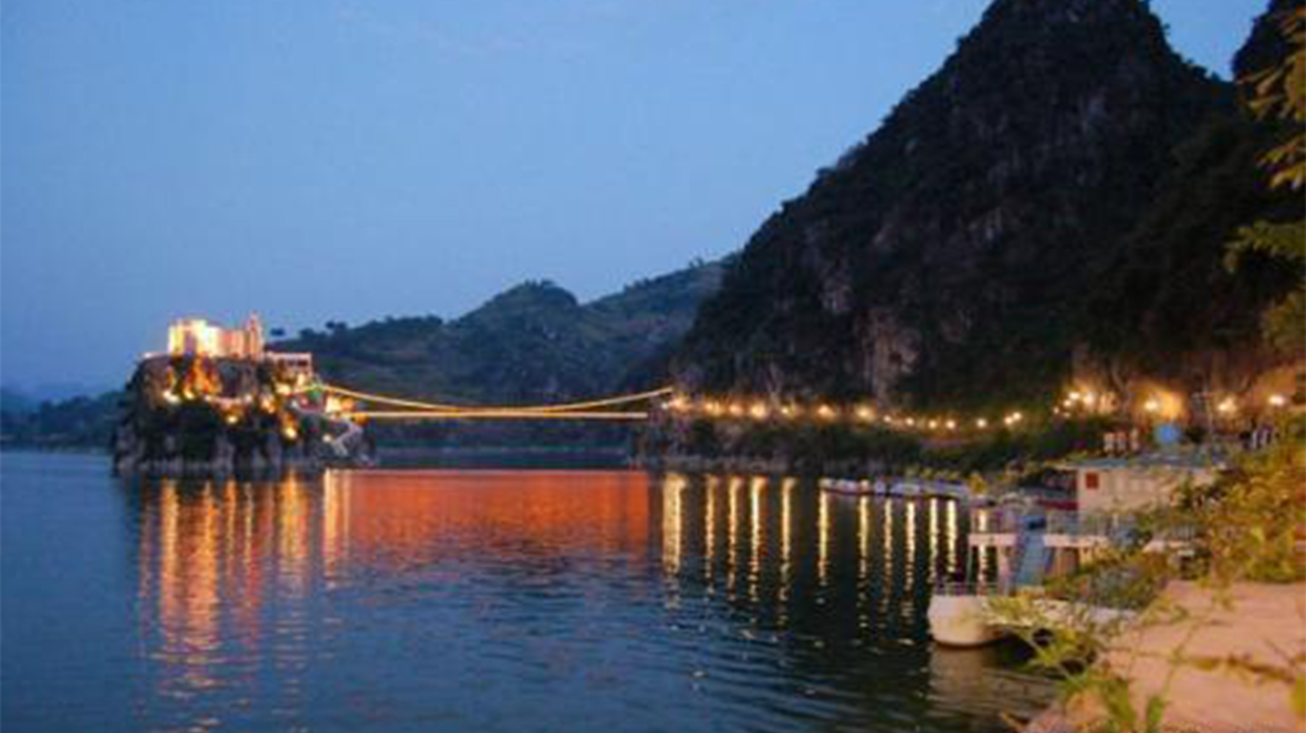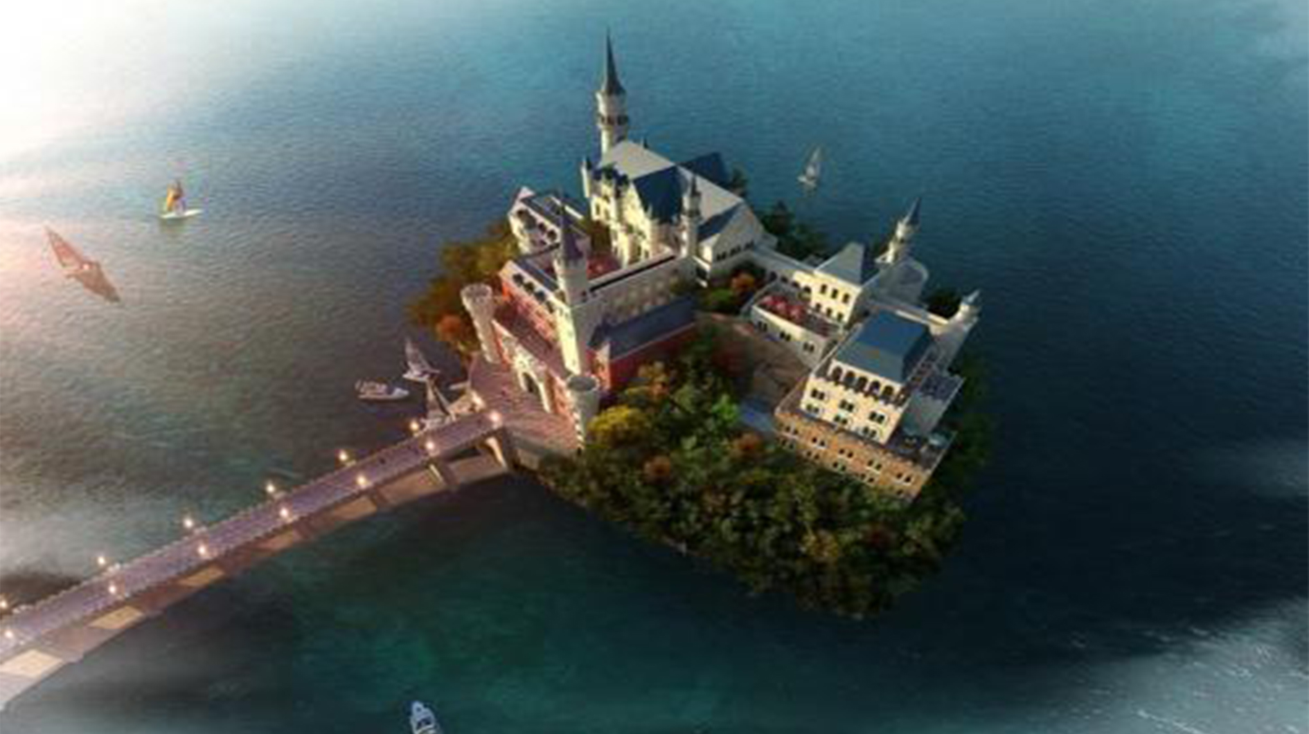 在平静宽阔的湖水之上,悬崖峭壁顶端是一座欧式的城堡酒店,唯一连接的是一条长长吊桥,在四周的环境中,突出城堡的独特气派,有一种安然的和谐美感。游客来一次绝对赞叹这个欧范的建筑物!