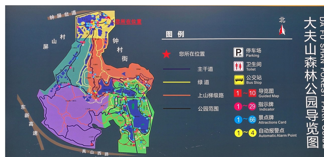 广州大夫山森林公园由湖光花木区,田园生态观光区、大夫山揽胜区、中心风景区、草坪旷野区、森林逗趣区、水寮野趣区和文体康乐区组成。园内有聚秀湖、红山湖、竹山湖、凤山湖、翠景湖、云岫湖、半岛观景台、果合景区、烧烤场、风筝场、儿童活动及成人活动场、钓鱼区、游艇码头及配套、凤山茶轩、园区道路11.8公里、登山步级路20公里。