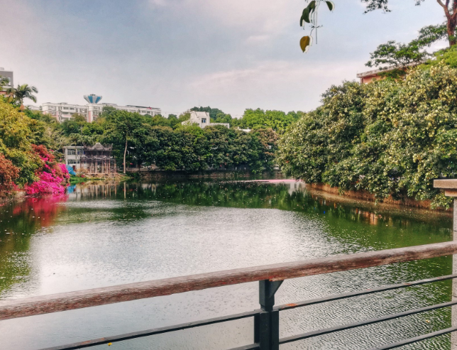四、麓湖公园白云山脚下的麓湖边,一向十分宁静,三月广东赏花地就去这里吧。每逢花开的季节,沿路两旁的紫荆花同时绽放,从艺博院广场到白云仙馆,沿着湖畔一直走,皆是看不尽的粉色花朵,就像沐浴在粉红色的花海里一样。而湖对岸,鹿鸣酒家旁,高大的紫荆花璀璨多姿,把山岗雄塔衬托得更加峻拔。