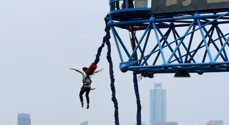 3、绑背弹跳者将装备绑在背上,倒数5,4,3,2,1后双手报胸双脚往下悬空一踩;仿佛由高空坠落,顿时感觉大地悬转;地面事物由小变大,非常刺激。