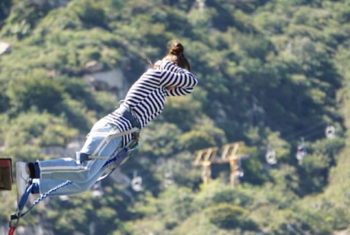 蹦极(Bungee Jumping),也叫机索跳,白话叫笨猪跳,是近些年来新兴的一项非常刺激的户外休闲活动。跳跃者站在约40米以上(相当于10层楼)高度的桥梁、塔顶、高楼、吊车甚至热气球上,把一端固定的一根长长的橡皮条绑在踝关节处然后两臂伸开,双腿并拢,头朝下跳下去。
