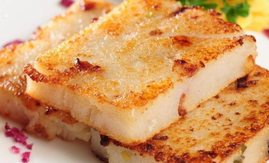 煎萝卜糕是广州人喜爱的一种点心,以黏米粉、萝卜丝为主料制成蒸糕。萝卜糕一般在平锅里用油煎几分钟,则香甜好食;而碗仔萝卜糕可热食,无须煎制。