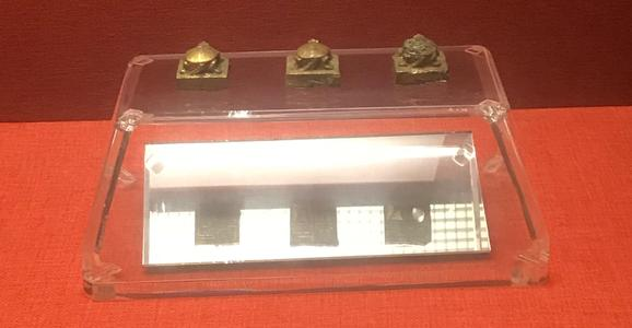 边长:2.15厘米 宽:2.15厘米 通钮高:1.5厘米 重: 65克“右夫人玺”金印是南越王墓中出土的出土的3枚金印中尺寸最小的一枚,但为四个夫人中唯一黄金印玺。金印以龟为钮。