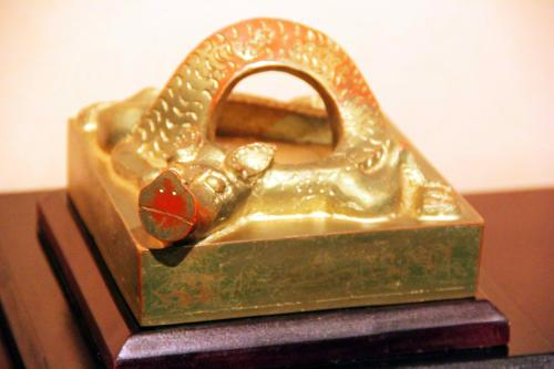 文帝行玺”金印出土于墓主人的胸部位置。印面边长3.1厘米,宽3厘米,通高1.8厘米,重148.5克,含金量是98%。印面阴刻“文帝行玺”四个字,应是南越文王的发布命令的官印。金印的印钮是一条游龙,盘曲成“S”形,龙头伸向一角,龙身上的鳞片和爪是铸成后凿刻的,龙腰隆起可以用来穿印绶。
