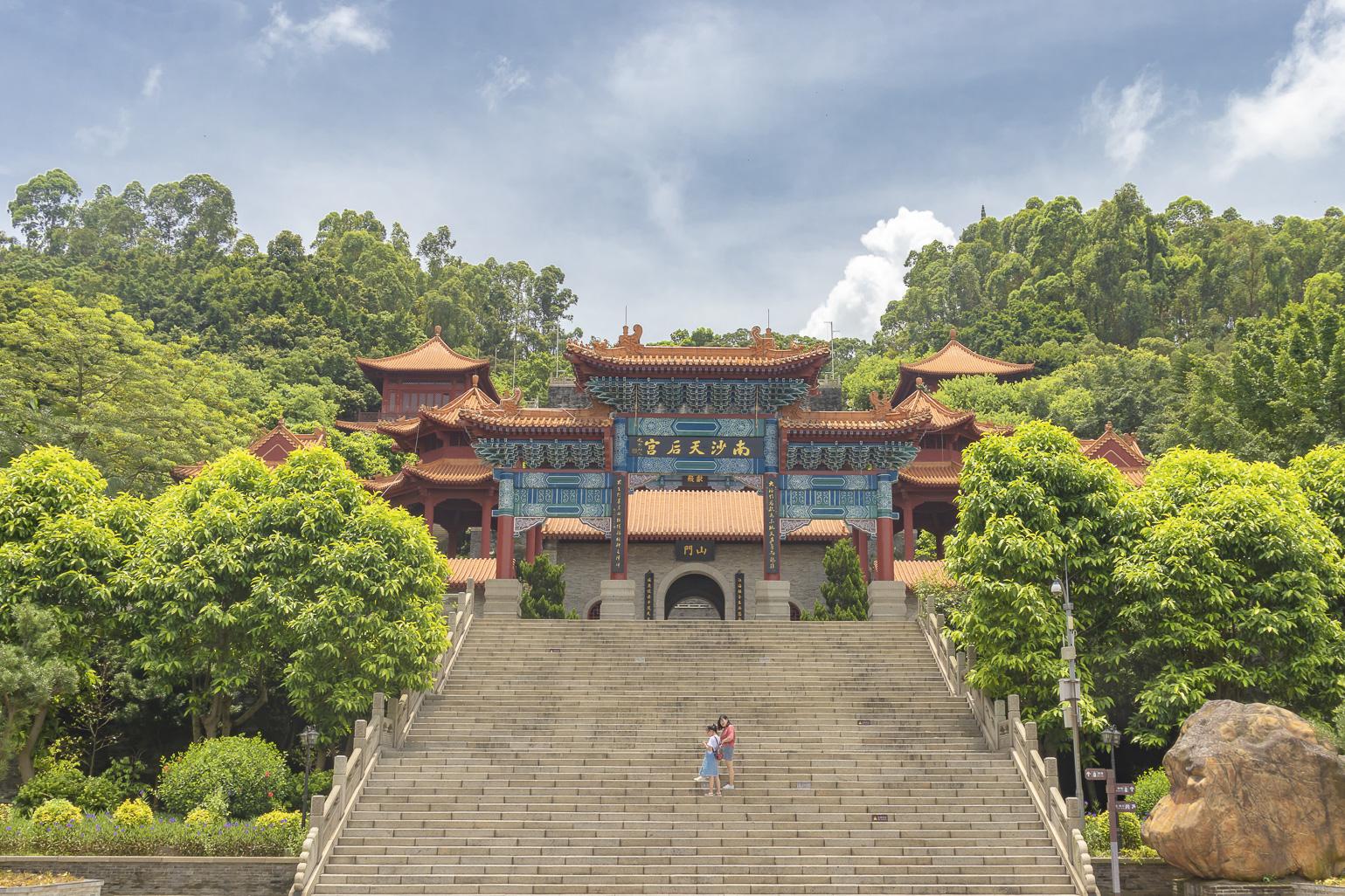 南沙天后宫,南望虎门与伶仃洋,它主要由天后宫广场和宫殿建筑群两个部份组成。天后宫广场中央高耸着高达14.5米的天后石雕像,据说由365块细心雕琢的花岗石构成,象征天后一年365天的庇佑,也是游人合影留念的必去之处。宫殿建筑群在天后宫广场的后方,整个是清朝时期的建筑风格,并且依山而建。