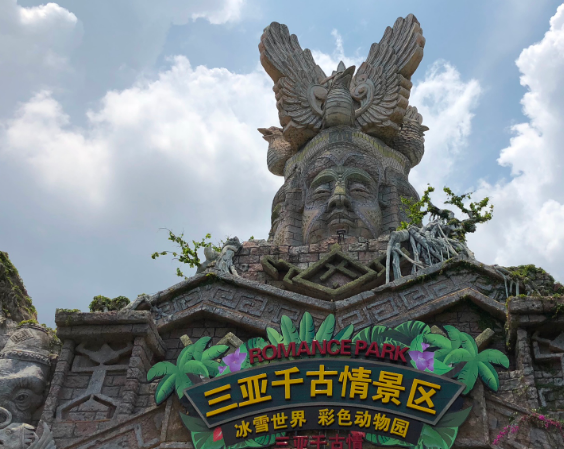 三亚千古情大剧院入口高23米、宽60米的巨型主题雕塑墙,以冼夫人骑着大象完成岭南统一的传说为创作元素。剧院为大型歌舞《三亚千古情》量身定制世界先进的灯光、音响、舞美、特效以及上万套舞台机械,共同演绎《三亚千古情》的历史传奇。