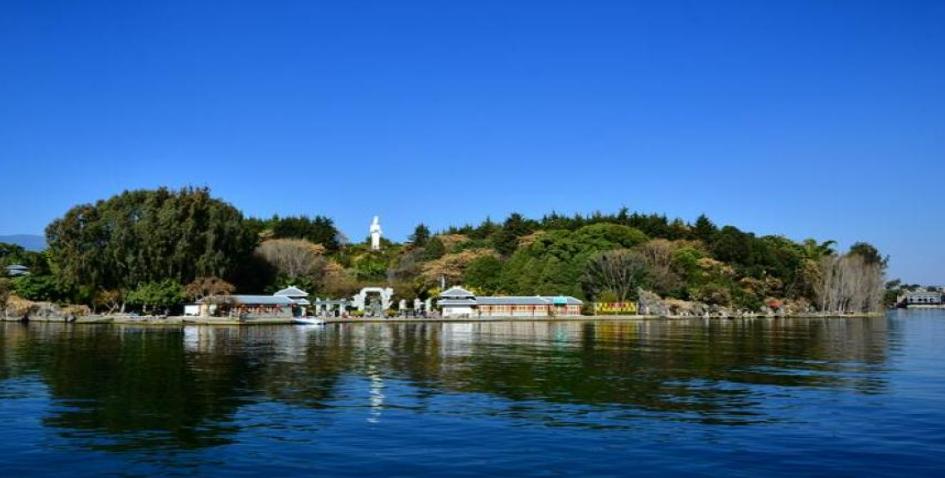 南诏风情岛是洱海三岛之一,原名玉几岛,不足百亩的南诏风情岛静卧在蓝天之下、碧水之中,既有丰富的人文景观,也蕴藏着无限的海岛景致。在码头广场,可观赏到“沙壹母”铜雕,沙壹母左手执鱼叉、右手置在前额、坐在沉木上仿佛若有所思,其后面排列的十尊柱型石雕人像,代表着沙壹母的10个儿子。