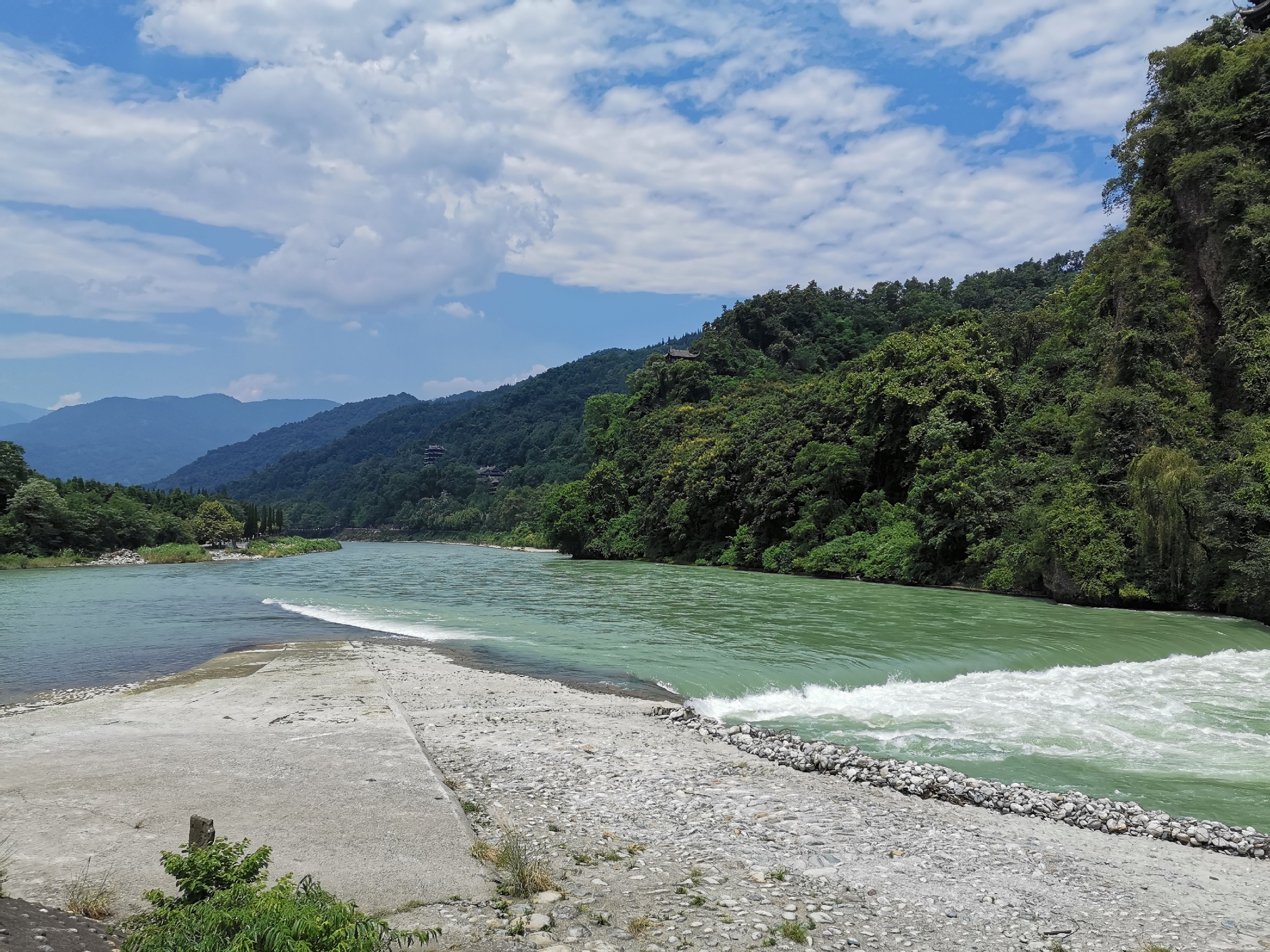 宝瓶口是进入都江堰景区的第一个水利工程,用以严格控制内江水进入成都平原的流量。因从高处看像瓶口,故而得名,亦取“保佑平安”之意。俯瞰宝瓶口最好的位置是伏龙观顶层,可观涛涛江水穿过宝瓶口的盛景。