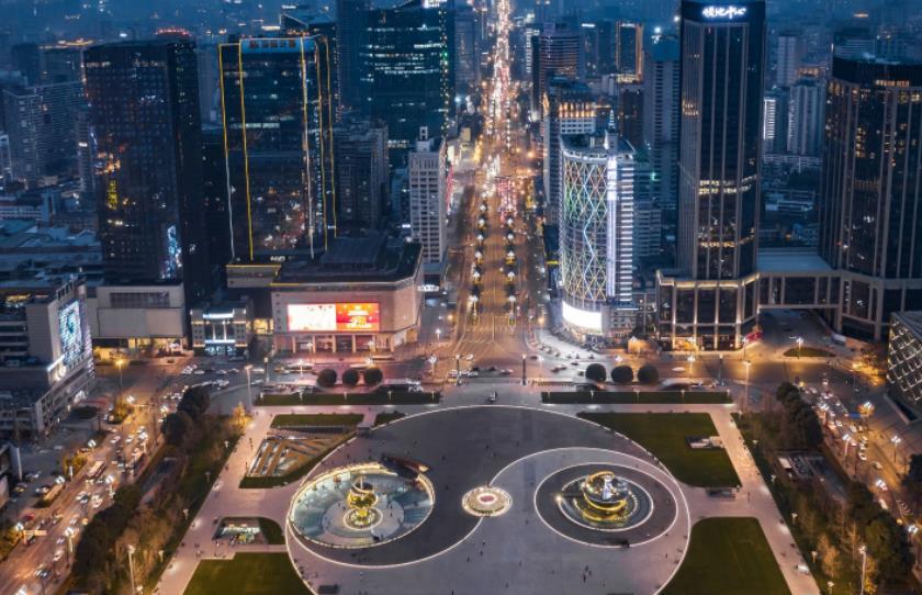想去看夜景,可以选择去天府广场,这里是成都的最中心地带,广场中间是一个圆柱形的金色太阳神鸟雕塑像,这个雕塑像来自于著名的金沙遗址,这个神鸟是有专门特殊象征意义的,它象征着光明、和谐还有生机勃勃的时代精神。