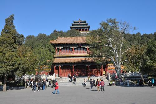 景山公园位于北京城南北中轴线的中心点上,南依故宫,西靠北海,北与鼓楼遥遥相望,曾是北京城中心的最高点。景山公园内古树参天,山峰独秀,殿宇巍峨,牡丹品种繁多,文化活动丰富。山上五亭横列,中锋万春亭坐落于北京城中轴线制高点,尽享天时地利,登临其上,可俯瞰故宫全景,一览京城轴线,领略整齐对称的布局神韵,品读气势恢宏的宫廷建筑。这里曾是明、清帝后祭祖追思的重要场所,保存着寿皇殿、观德殿、护国忠义庙、绮望楼等古迹文物,散发着浓厚的根祖气息,是传承和发扬中华孝道文化的圣地。