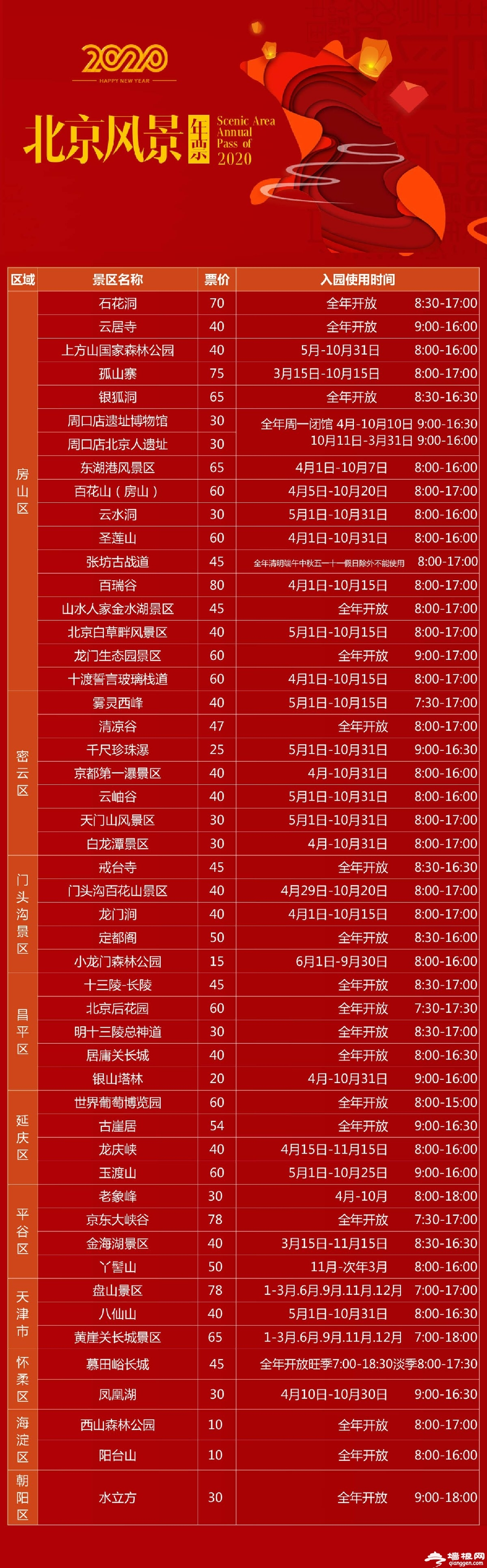 颐和园、天坛公园、中山公园、北海公园、景山公园、陶然亭公园、北京动物园、香山公园、北京植物园、玉渊潭公园、双秀公园、莲花池公园、国际雕塑园、大观园、地坛公园、月坛公园、丰台花园、万芳亭公园、水立方以及原京津冀名胜文化休闲旅游年卡所涵盖的景区。
