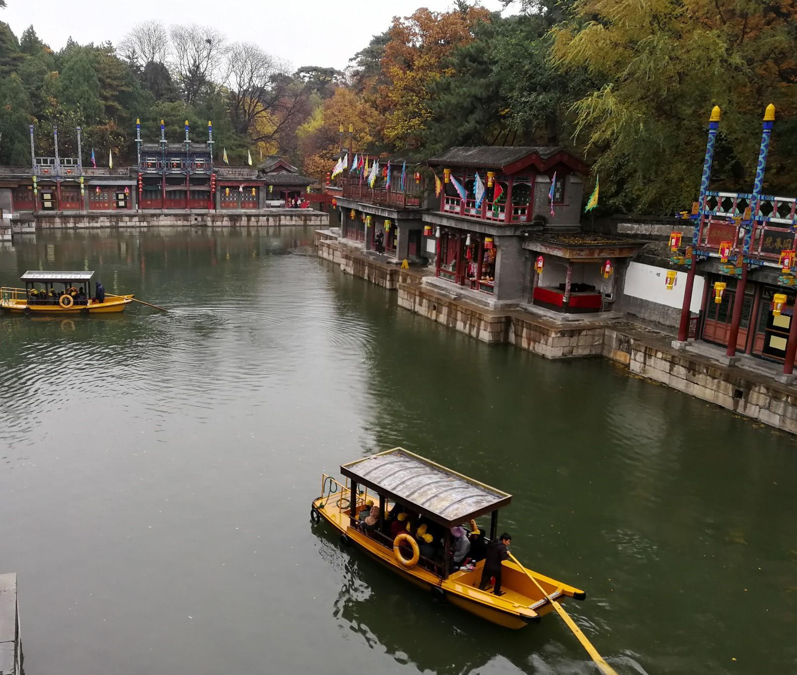 与前湖一水相通的苏州街,酒幌临风,店肆熙攘,仿佛置身于二百多年前的皇家买卖街,谐趣园则曲水复廊,足谐其趣。在昆明湖湖畔岸边,还有著名的石舫,惟妙惟肖的铜牛,赏春观景的知春亭等点景建筑非常好。后山后湖碧水潆回,古松参天,环境清幽。