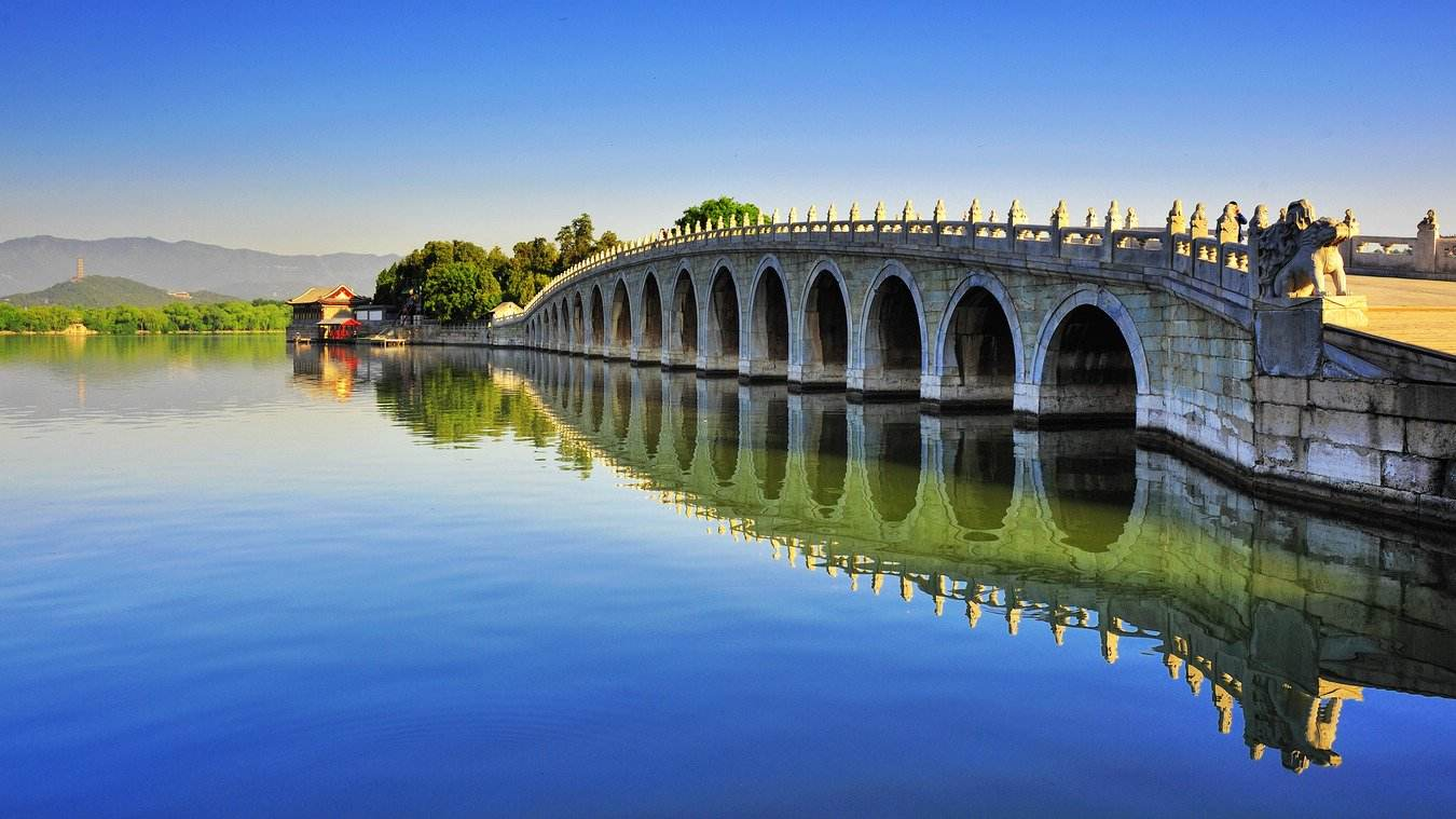 巍峨高耸的佛香阁八面三层,踞山面湖,统领全园。碧波荡漾的昆明湖平铺在万寿山南麓,约占全园面积的3/4。昆明湖中,宏大的十七孔桥如长虹偃月倒映水面,湖中有一座南湖岛,十七孔桥和岸上相连。蜿蜒曲折的西堤犹如一条翠绿的飘带,萦带南北,横绝天汉,堤上六桥,婀娜多姿,形态互异。涵虚堂、藻鉴堂、治镜阁三座岛屿鼎足而立,寓意着神话传说中的“海上仙山 ”。阅看耕织图画柔桑拂面,豳风如画,乾隆皇帝曾在此阅看耕织活画,极具水乡村野情趣。