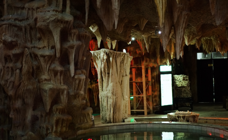 温泉长廊采用中国明清古典建筑风格,室内贴有清朝壁画、宫灯等等装饰,来点缀室内清朝的气氛。睡觉的地方是日式“榻榻米”形式,床的下面是温泉管道,躺在上面,感觉下面温泉水的流动,别有一番滋味。后面还有一个小院,院中种植了竹林,竹林当中有两个温泉小泡池,一池冷温泉、一池热温泉,故名为“冰火浴”。