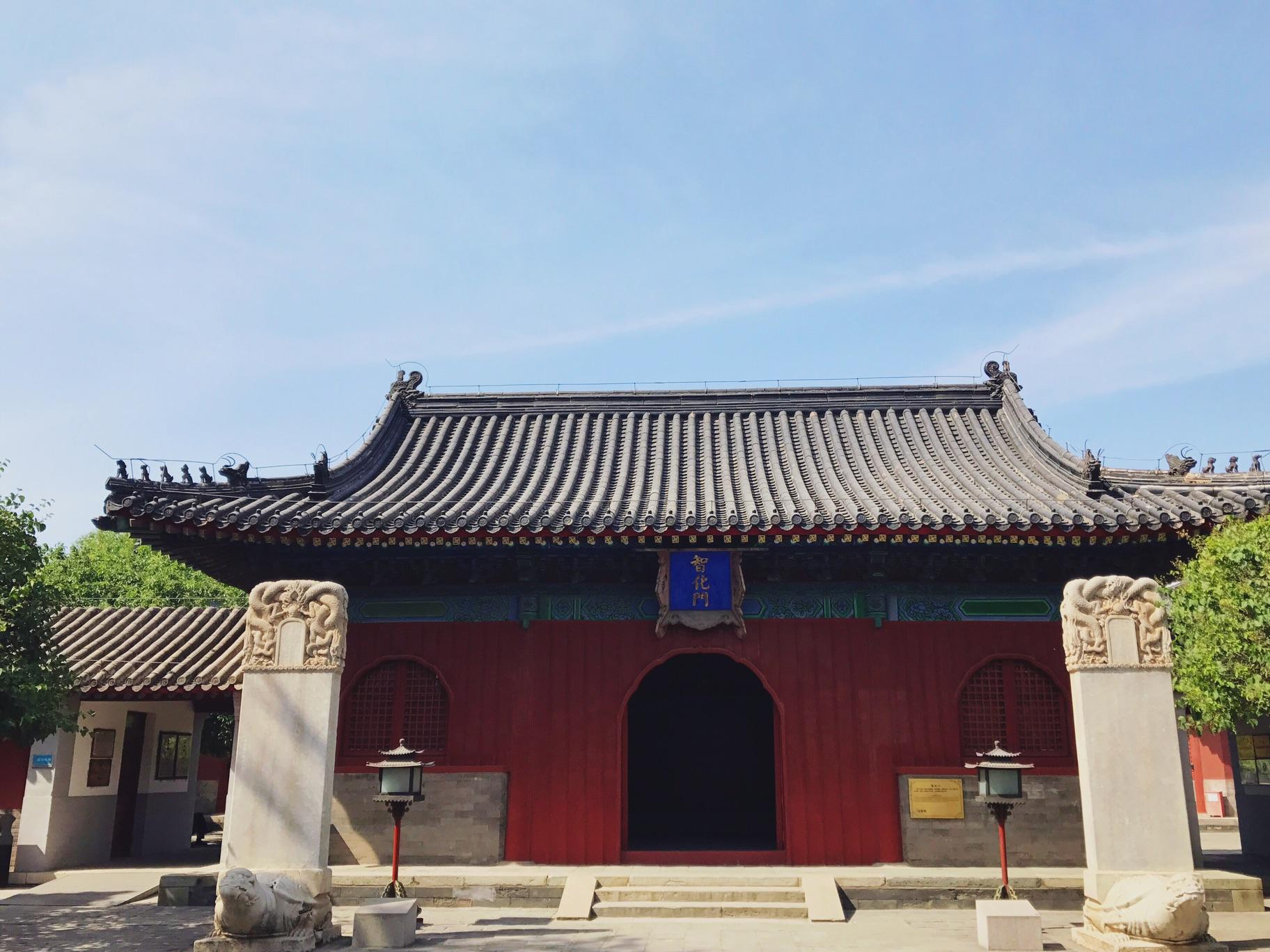 由于路面的抬高,智化寺的山门如今位于路面之下,空间略显局促,两侧的狮子面容已模糊。进去之后的第一进院落较小,正对面的便是智化门,即天王殿,三开间的单檐歇山顶,门窗间装直板,板缝加木条。智化门内原有弥勒造像,现已无存。智化门前两通石碑,均为王振于正统九年九月九日所立。殿内所有建筑屋顶用的都是黑色琉璃瓦,比不上皇家敕建寺庙的黄色琉璃。但我还挺喜欢这种低调沉稳的风格。