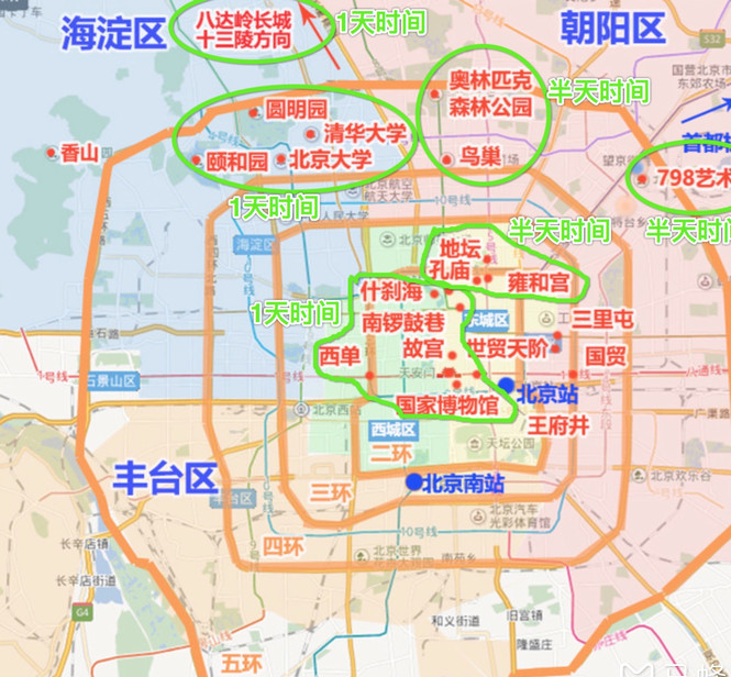 大多数古迹类景点都在二环,故宫这一圈最经典的怎么也得一天,最多晚上再加个购物的地方;主要的几个购物地方都在二三环之间,西单、王府井、世贸天阶、三里屯,可以选一个,晚上去。