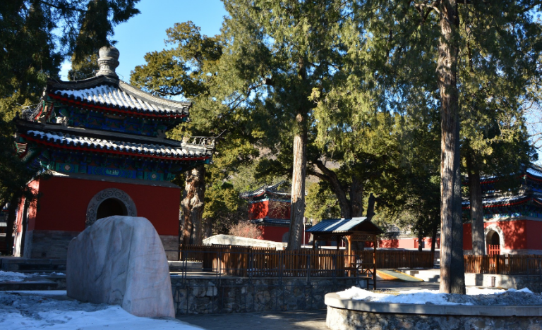 三、千年银杏:在无量寿殿前的左右各有一株银杏树。北面的一株雄性银杏,相传是辽代所植,距今已有900多年的历史,故称千年银杏、辽代“银杏王”。银杏树高25米左右,胸径7.5米。乾隆曾写诗赞誉:“古柯不计数人围,叶茂孙枝缘荫肥。世外沧桑阅如幻,开山大定记依稀”。