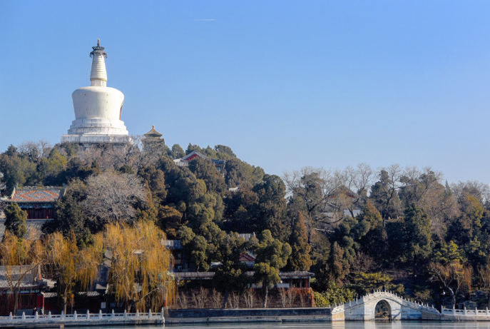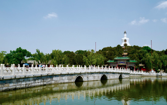 北海园林的开发始于辽代,金代又在辽代初创的基础上于大定十九年(1179年)建成规模宏伟的太宁宫。太宁宫沿袭我国皇家园林“一池三山” 的规制,并将北宋汴京艮岳御园中的太湖石移置于琼华岛上。至元四年(1267年),元世祖忽必烈以太宁宫琼华岛为中心营建大都,琼华岛及其所在的湖泊被划入皇城,赐名万寿山、太液池。永乐十八年(1420年)明朝正式迁都北京,万寿山、太液池成为紫禁城西面的御苑,称西苑。明代向南开拓水面,形成三海的格局。清朝承袭明代的西苑,乾隆时期对北海进行大规模的改建,奠定了此后的规模和格局。