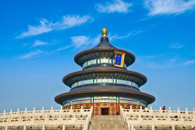 天坛北京市东南部,崇文区永定门内大街东侧。占地约270万平方米,是中国现存最大的古代祭祀性建筑群。今日天安门东侧的劳动人民文化宫就是当年皇帝祭祖的地方,西侧的中山公园是祭祀丰收神即五谷耕地之所。在整个北京城里,北有地坛祭地,南有天坛祭天,东有日坛祭太阳,西有月坛祭月亮,其中天坛最为光彩夺目、气宇非凡。天坛始建于明永乐十八年(1420年),清乾隆、光绪时曾重修改建。为明、清两代帝王祭祀皇天、祈五谷丰登之场所。天坛是圜丘、祈谷两坛的总称,有坛墙两重,形成内外坛,坛墙南方北圆,象征天圆地方。