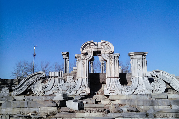 圆明园圆明园遗址公园位于北京市海淀区中部偏东,西北去西直门二十华里,东南角为清华大学西门。圆明园遗址公园为著名的爱国主义教育基地。圆明园遗址公园建成于1988年,仅存山形水系、园林格局和建筑基址,假山叠石、雕刻残迹仍然可见。在“西洋楼”旧址建有园史展览馆,供人瞻仰凭吊。圆明园始建于康熙46年(1707年),由圆明园、长春园、绮春园三园组成,占地350万平方米,其中水面面积约140万平方米,有园林风景百余处,建筑面积逾16万平方米。