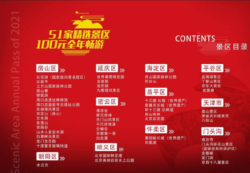 2021北京风景年票从“北京市风景名胜区协会”所辖景区中优选50+景区,在保留众多4A级风景名胜的同时,新增:1、九眼楼风景区;2、京西十八潭;3、北京国际鲜花港;4、北京奥林匹克水上公园等热门景区,不仅覆盖了北京周边的多数景区,还能满足不同人群全年不同季节的出游所需。