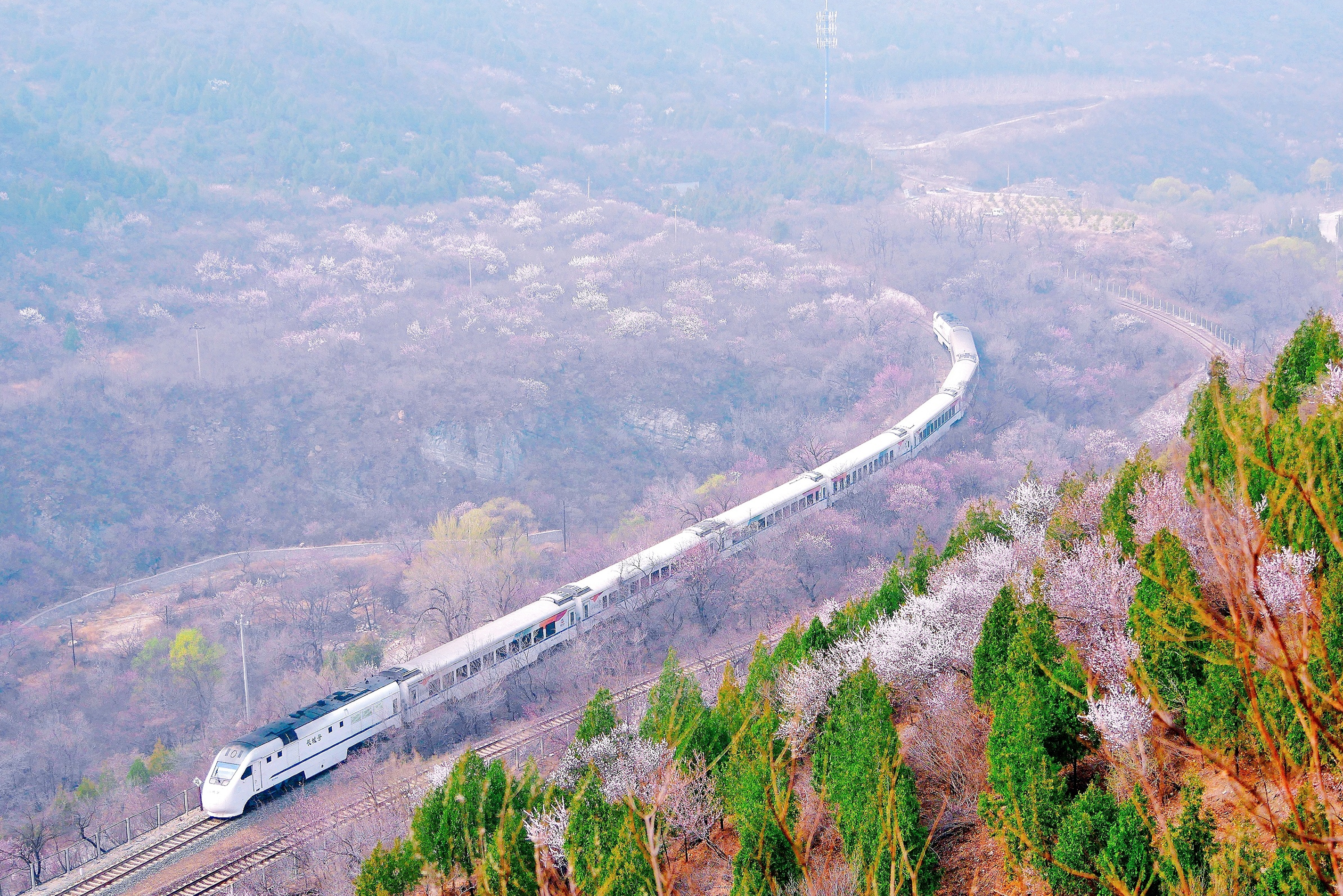 北京赏花列车的特点:S2线列车沿着天下第一雄关从居庸关长城穿过,长城似一条蜿蜒在山颠之上的巨龙,与山下列车共舞。列车穿梭在千枝万树交织而成的簇簇花朵中,仿佛坠入层层叠叠的梦幻花海。过往列车带起无数花瓣,浪漫极了。