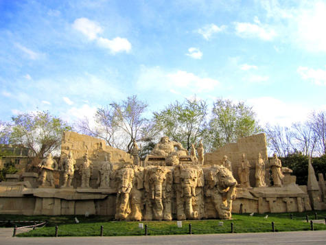 “四海宾朋”景区:位于中华民族园南侧,此景区反映了元代是个对外开放的国家,礼贤下士,世界各国纷纷前来朝拜、觐见或进行交往的政治特点。景区北侧三个下沉式马面广场上的“清花瓷器”、“箭与盾”、“铜墙铁壁”雕塑反映了元朝艺术、军事等方面的成就。