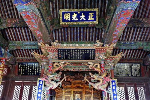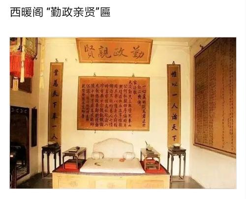 勤政亲贤殿:勤政亲贤殿即养心殿西暖阁前室,位于正大光明殿东面,为盛暑时皇帝办公之处,有殿堂5间。北设宝座,南为窗,东有板墙开门,与养心殿明间相通,为皇帝召见大臣之所。窗外抱厦内围有木屏,与明间相隔,较为隐秘。现为宫廷生活原状陈列。