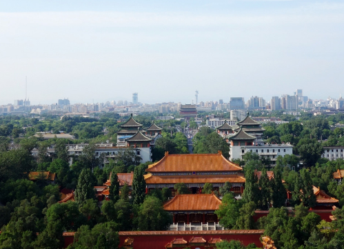 景山,元代,这里有座小土丘,名叫青山,属于元大内后苑的范围。明代在北京修建皇宫时,曾在这里堆过煤,所以又称煤山。由于它的位置正好在全城的中轴线上,又是皇宫北边的一道屏障,所以,风水术士称它为 镇山。明清时园内种了许多果树,养过鹿、鹤等动物,因而山下曾叫百果园,山上曾叫万岁山。清顺治十二年(1655),改名为景山。 景山名称含意有三:首先是高大的意思。《诗·殷武》中有"陟彼景山,松柏丸丸"之句,说的是3000年前商朝的都城内有一座景山;其次,因为这里是帝后们"御景"之地;再次,有景仰之意。该园1928年辟为公园。