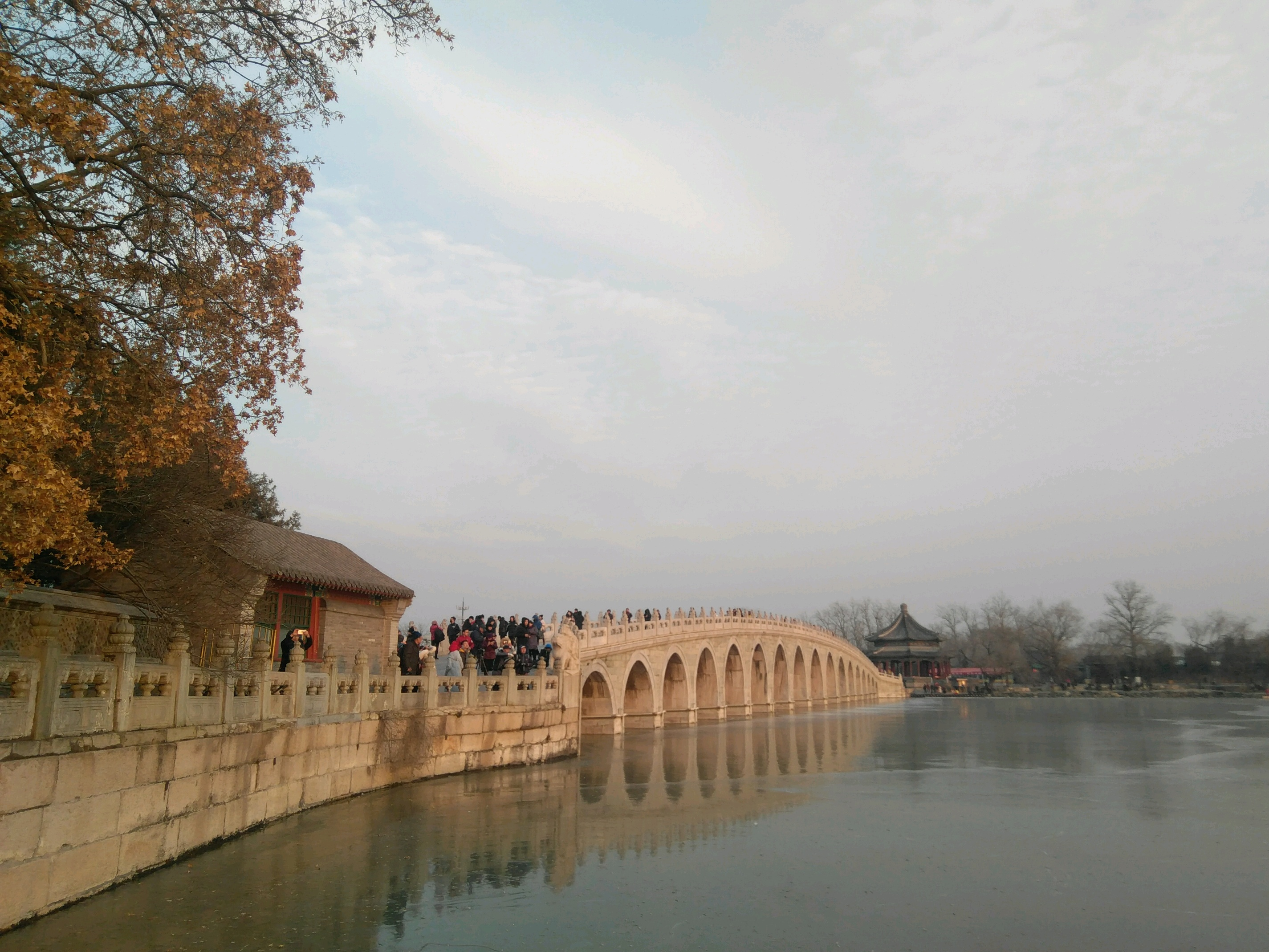 谐趣园在万寿山东麓,是一个独立成区、具有南方园林风格的园中之园。清漪园时名叫惠山园”,是仿无锡惠山寄畅园而建。嘉庆十六年(1811年)重修后,取“以物外之静趣,谐寸田之中和”和乾隆皇帝的诗句“一亭一径,足谐奇趣”的意思,改名为“谐趣园”。园内共有亭、台、堂、榭十三处,并用百间游廊和五座形式不同的桥相沟通。园内东南角有一石桥,桥头石坊上有乾隆题写的“知鱼桥”三字额,是引用了庄子和惠子在“秋水濠上”的争论而来的。
