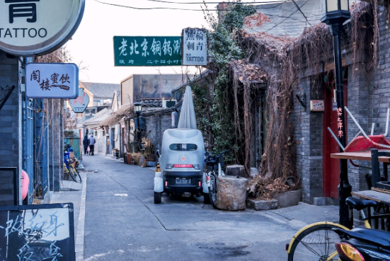 烟袋斜街东口在鼓楼前大街路西,其走向自东偏向西北,进东口约50米路北即为大石碑胡同的南口,可通往鼓楼西大街。