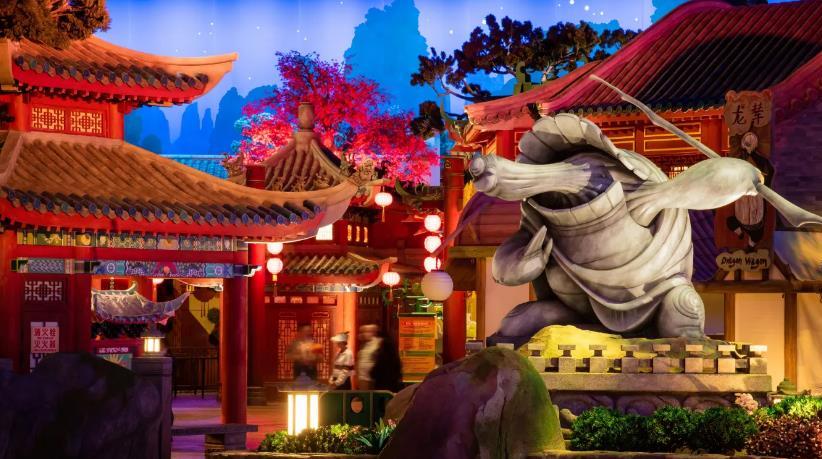 功夫熊猫盖世之地主题景区取材系列动画影片《功夫熊猫》,将功夫熊猫的世界展现给游客,游客将同阿宝一起,踏上成为一代武术大师的追梦之旅。在该处可以在平先生面馆感受浓郁鲜香,也可以在与神龙大侠的旅程中体验功夫的魅力。整个景区围绕“中国式传奇体验”进行设计,打造全室内景点,将成为全球首个以“功夫熊猫”为主题的景区。在该处,游客将被环绕在众多包含原汁原味中国元素的景点之中,包括“功夫熊猫”影迷们喜爱的翡翠宫、熊猫村和智慧仙桃树。