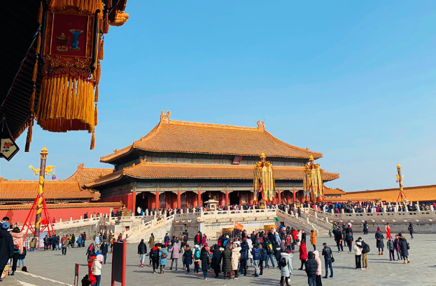 故宫宫殿是沿着一条南北向中轴线排列,三大殿、后三宫、御花园都位于这条中轴线上。并向两旁展开,南北取直,左右对称。