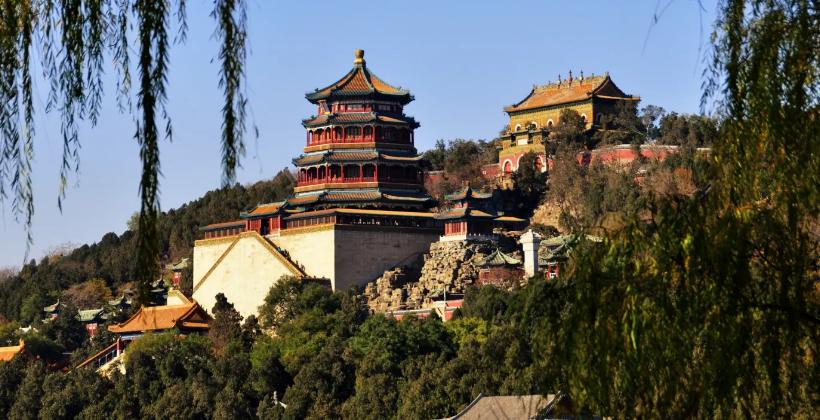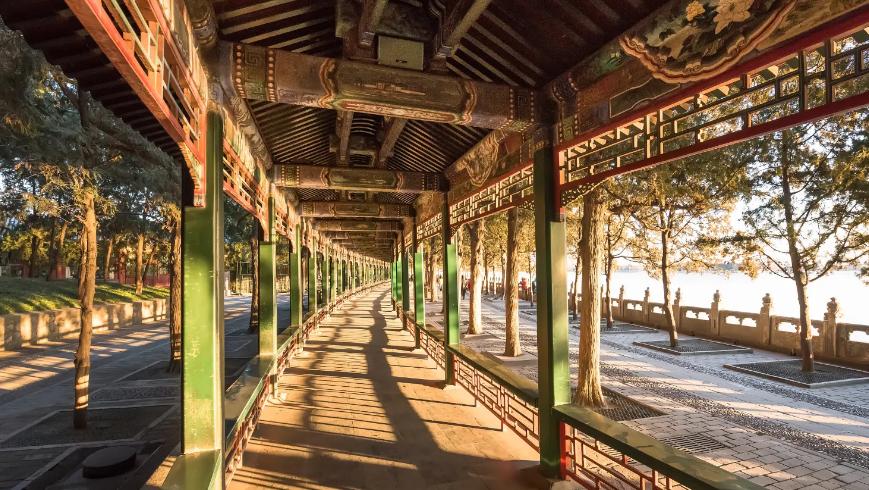历史:颐和园长廊在万寿山南麓和昆明湖北岸之间。始建于清代乾隆十五年(1750),1860年被英法联军焚毁后,于1888年又重新建造。长廊东起邀月门,西至石丈亭,中间穿过排云门,象征春夏秋冬四季。