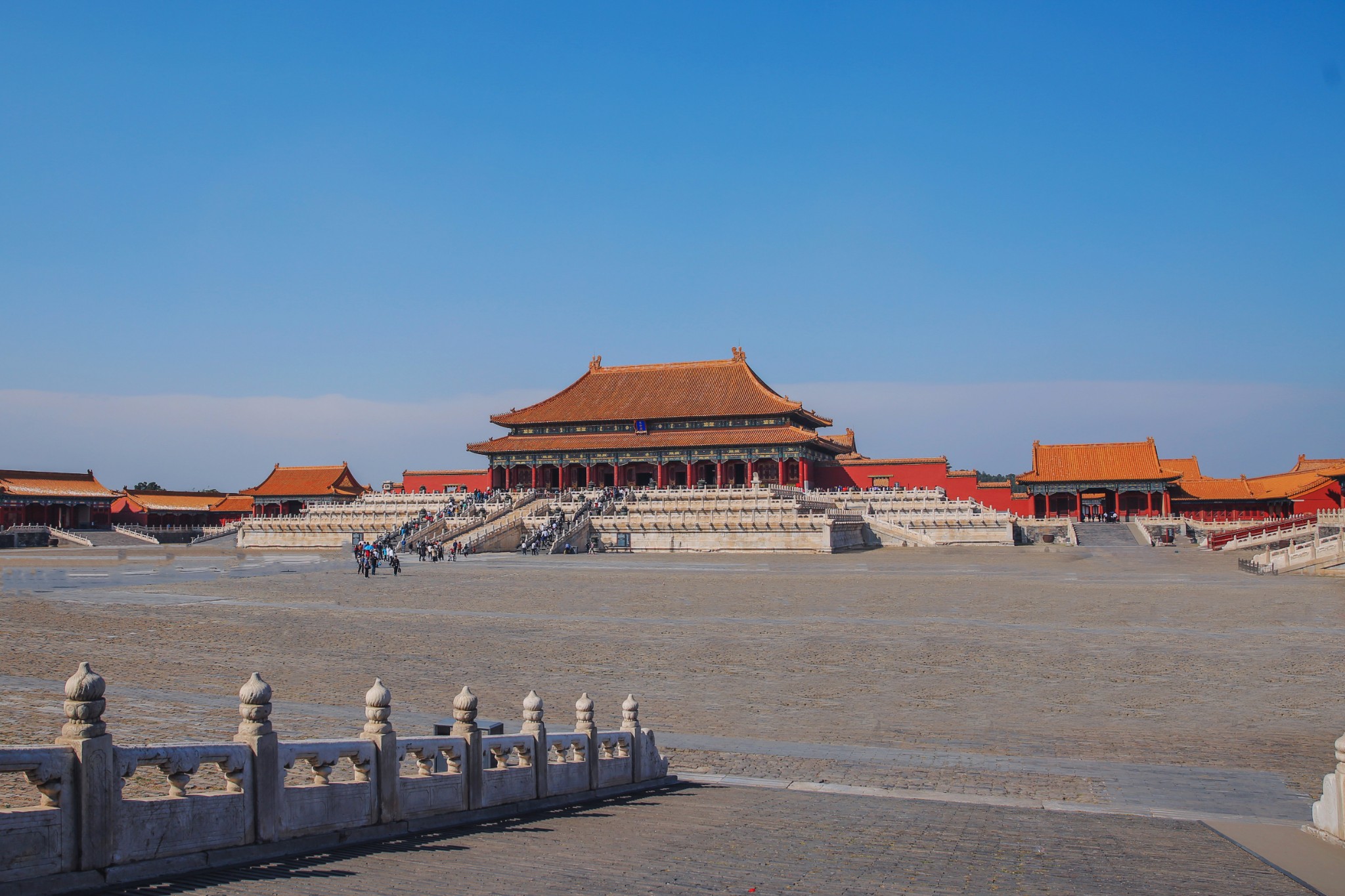 北京故宫内的建筑分为外朝和内廷两部分。外朝的中心为太和殿、中和殿、保和殿,统称三大殿,是国家举行大典礼的地方。三大殿左右两翼辅以文华殿、武英殿两组建筑。内廷的中心是乾清宫、交泰殿、坤宁宫,统称后三宫。