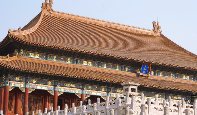 北京故宫于明成祖永乐四年(1406年)开始建设,以南京故宫为蓝本营建,到永乐十八年(1420年)建成。它是一座长方形城池,南北长961米,东西宽753米,四面围有高10米的城墙,城外有宽52米的护城河。紫禁城内的建筑分为外朝和内廷两部分。外朝的中心为太和殿、中和殿、保和殿,统称三大殿,是国家举行大典礼的地方。内廷的中心是乾清宫、交泰殿、坤宁宫,统称后三宫,是皇帝和皇后居住的正宫。