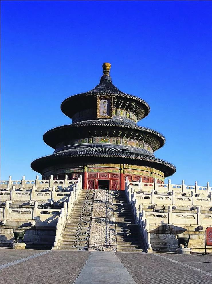 圜丘坛圜丘坛是举行冬至祭天大典的场所,主要建筑有圜丘、皇穹宇及配殿、神厨、三库及宰牲亭,附属建筑有具服台、望灯等。圜丘明朝时为三层蓝色琉璃圆坛,清乾隆十四年(1749)扩建,并改蓝色琉璃为艾叶青石台面,汉白玉柱、栏。圜丘形圆象天,三层坛制,高5.17米,下层直径54.92米,上层直径23.65米,每层四面出台阶各九级。上层中心为一块圆石,外铺扇面形石块九圈,内圈九块,以九的倍数依次向外延展,栏板、望柱也都用九或九的倍数,象征“天”数。