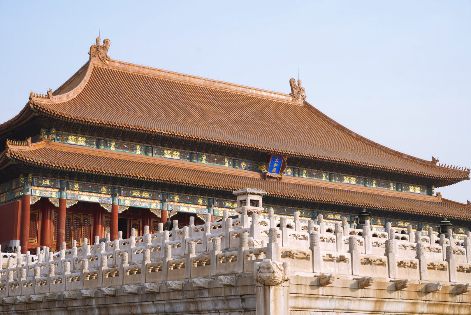 午门是故宫的正门。俗称五凤楼。东西北三面以12米高的城台相连,环抱一个方形广场。有1组建筑。正中有重楼,是9间面宽的大殿,重檐庑殿顶,在左右伸出两阙城墙上,建有联檐通脊的楼阁四座,明廊相连,两翼各有13间的殿屋向南伸出,四隅各有高大的角亭,辅翼着正殿。这组城上的建筑,是故宫宫殿群中第一高峰。
