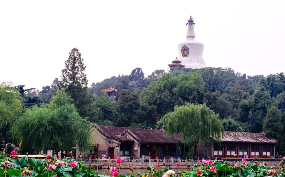 ,位于琼华岛高处,是一座藏传佛教塔。塔高36米,上圆下方,为须弥山座式,塔顶设有宝盖、宝顶,并装饰有日、月及火焰花纹,以表示"佛法"象日、月那样光芒四射,永照大地。白塔矗立于琼岛上,绿荫拥簇,巍峨壮美,堪称北海公园的标志。