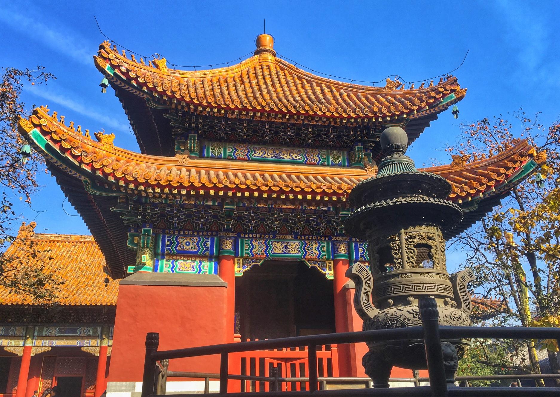 雍和宫位于北京市区东北角,清康熙三十三年(1694年),康熙帝在此建造府邸、赐予四子胤禛,即后来的雍亲王府。雍正三年,改王府为行宫,称雍和宫,雍正十三年,雍正帝驾崩,曾于此停放灵柩,因此,雍和宫主要殿堂原绿色琉璃瓦改为黄色琉璃瓦。