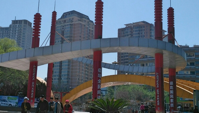 :公园南大门为5根红色立柱架托出两道浮云,第一道浮云为金黄色,第二道浮云为银灰色;第一道金黄色浮云象征凤凰,喻意“丹凤朝阳”;第二道银灰色浮云象征龙,喻意“龙凤呈祥”。