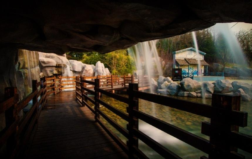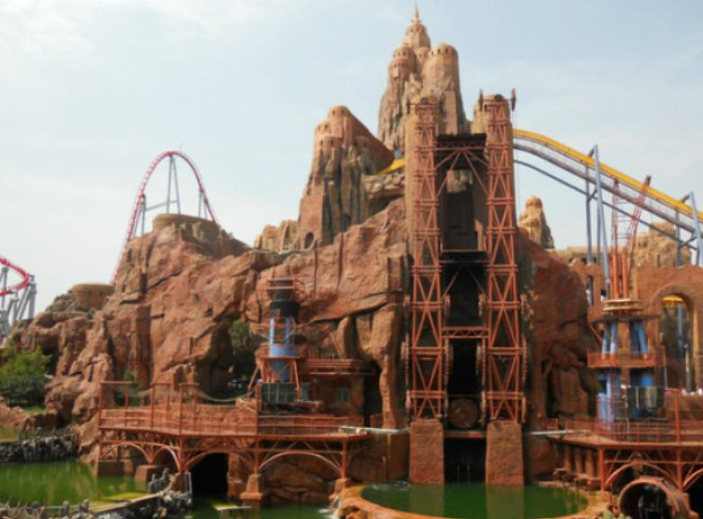 亚洲最高的双提升激流勇进,小船分别在10米和26米的高点,顺势下冲,提升到约74km/h的时速,溅起巨大的水浪,涌动着漂流的小舟。水浪不仅会洒落在刚刚结束探险之旅的小船上,也会溅到港湾观看的人群中。