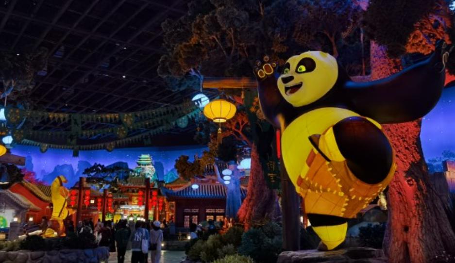 功夫熊猫盖世之地主题景区取材系列动画影片《功夫熊猫》,将功夫熊猫的世界展现给游客,游客将同阿宝一起,踏上成为一代武术大师的追梦之旅。