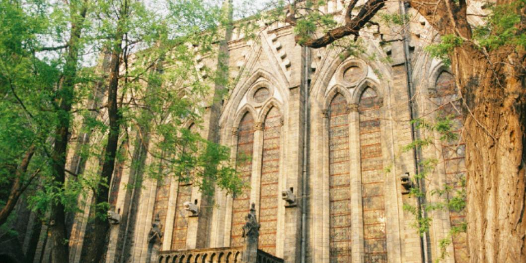 西什库教堂俗称北堂,曾经长期作为天主教北京教区的主教座堂,是北京最大和最古老的教堂之一。北堂是典型的哥特式建筑;大堂平面呈十字架形状,左右两侧各有一中式四角攒尖黄色琉璃瓦顶的亭子,亭内是乾隆亲笔题写的石碑。
