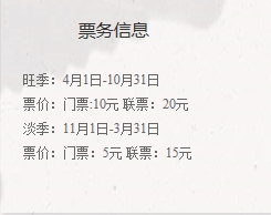 门票 旺季(4月-10月):10.00元 淡季(11月-次年3月):5.00元
