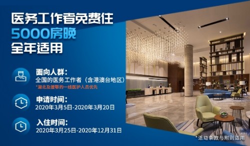为致敬全国的医务工作者,来自三亚、上海、北京、广州、深圳和杭州等39座城市的55家希尔顿欢朋酒店累计开放了5000个免费房,供医务工作者们在疫情结束后放松小住。除此之外,还有北京威斯汀酒店、北京中信金陵酒店、北京五洲酒店、北京雁栖酒店等酒店也免费。
