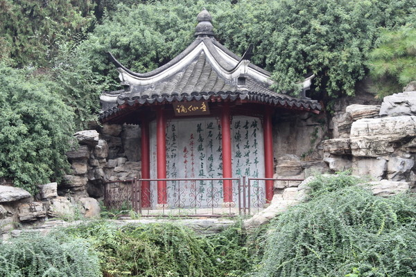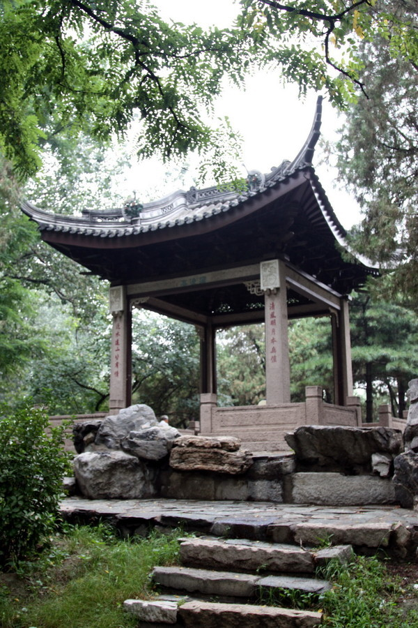 “却忆谪仙诗格俊,解吟秀出九芙蓉”,是为纪念唐代大诗人李白而修建的。为飞檐起翘葫芦宝顶式的半壁亭。亭内镶刻着丘睿作的《过采石吊李谪仙》和杨荣作的《李白赞》诗二首。谪(音:zhe,意:贬)仙,有人把李白称为谪仙。