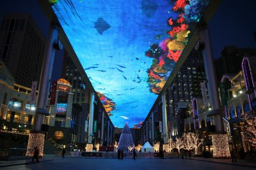 世贸天阶是层次起伏的欧式建筑,但最令人感兴趣的,一定会是中央大道上长250米,宽30米,总面积7500平方米的全世界最大的LED屏幕。