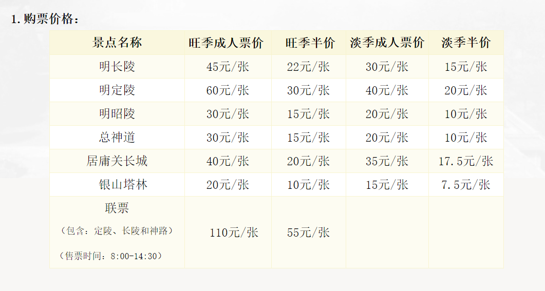 注:联票包括长陵、定陵、昭陵、神路四个景区。